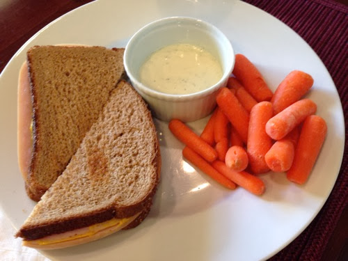 Lunch was a turkey sandwich, carrots and ranch dressing.